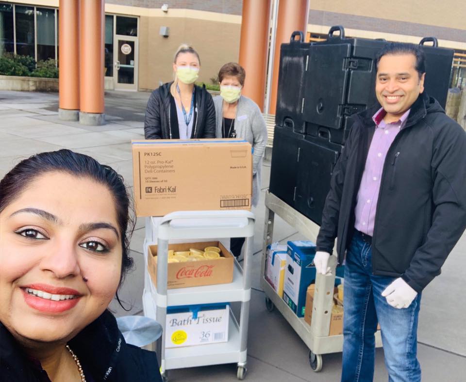 Aahaar owners dropping off boxed hot lunches at Swedish Hospital, 4/1/20