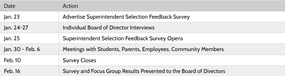 “The major difference between the two is that a traditional search process includes posting the position, actively recruiting individuals to apply, reviewing applicants, selecting finalists, conducting interviews, and providing the community the opportunity to meet candidates and give input prior to the School Board making the hiring decision. This selection process offers key stakeholders an opportunity to share their priorities and input regarding our school district’s leadership before the Board confirms their selection for this important role.”