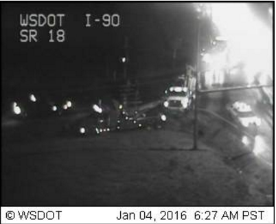 Around 4:30AM a semi had slipped at the westbound on-ramp to I-90 from SR 18, and partially blocked the ramp until around 7AM. It caused a long back up along Snoqualmie Parkway until it was cleared.