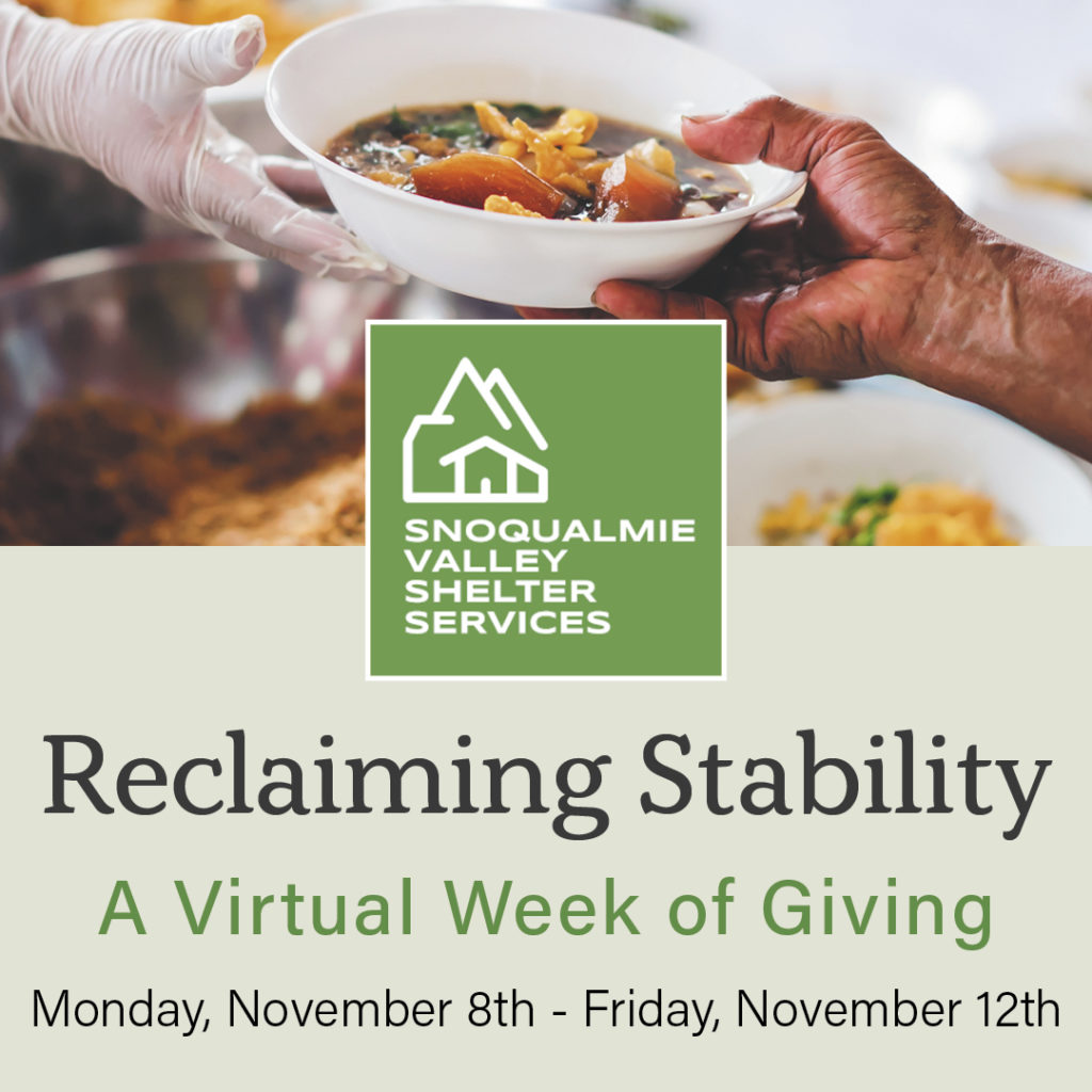 So, this year, their primary fundraising event is a 5-day Week of Giving. Join Snoqualmie Valley Shelter Services (SVSS) for their Reclaiming Stability Virtual Week of Giving fundraiser from Monday, November 8th – Friday, November 12th, 2021.