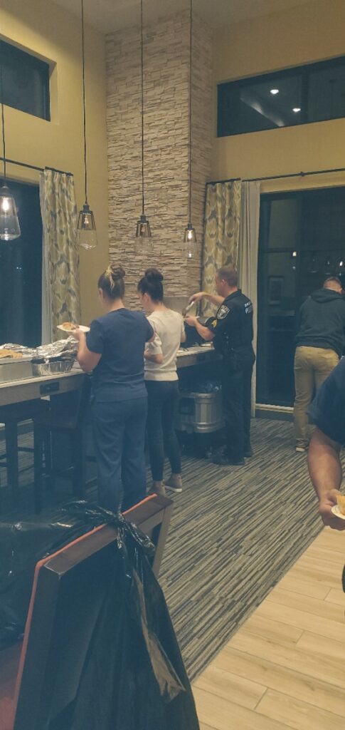 The firefighters slowly trickled in and seemed surprised to see the feast awaiting them. Keri and I stationed ourselves at the front door exclaiming to every new face that their “Mother called, said they were too skinny, and they needed to eat.” Estes’ flight attendant training was apparent as she worked the room to make every person feel at ease. A few attendees even remarked that they all loved talking with different crews while they feasted.