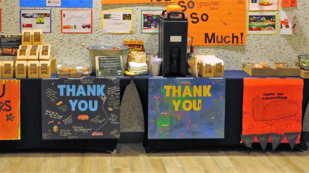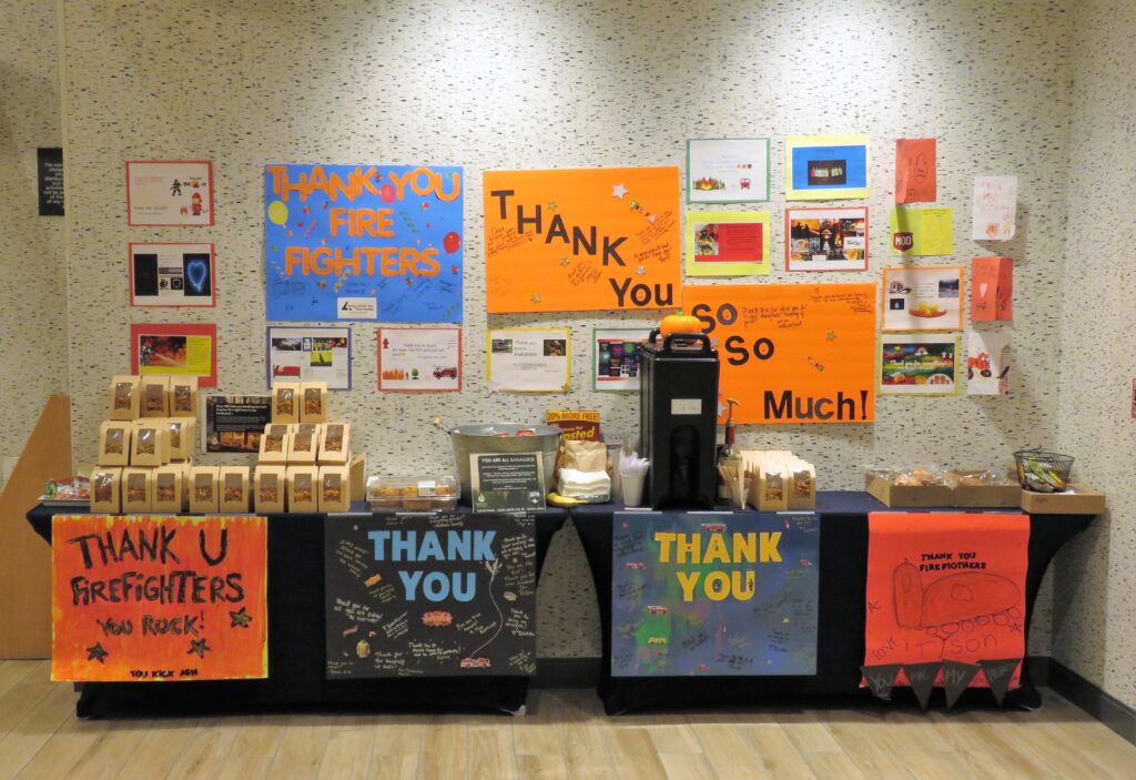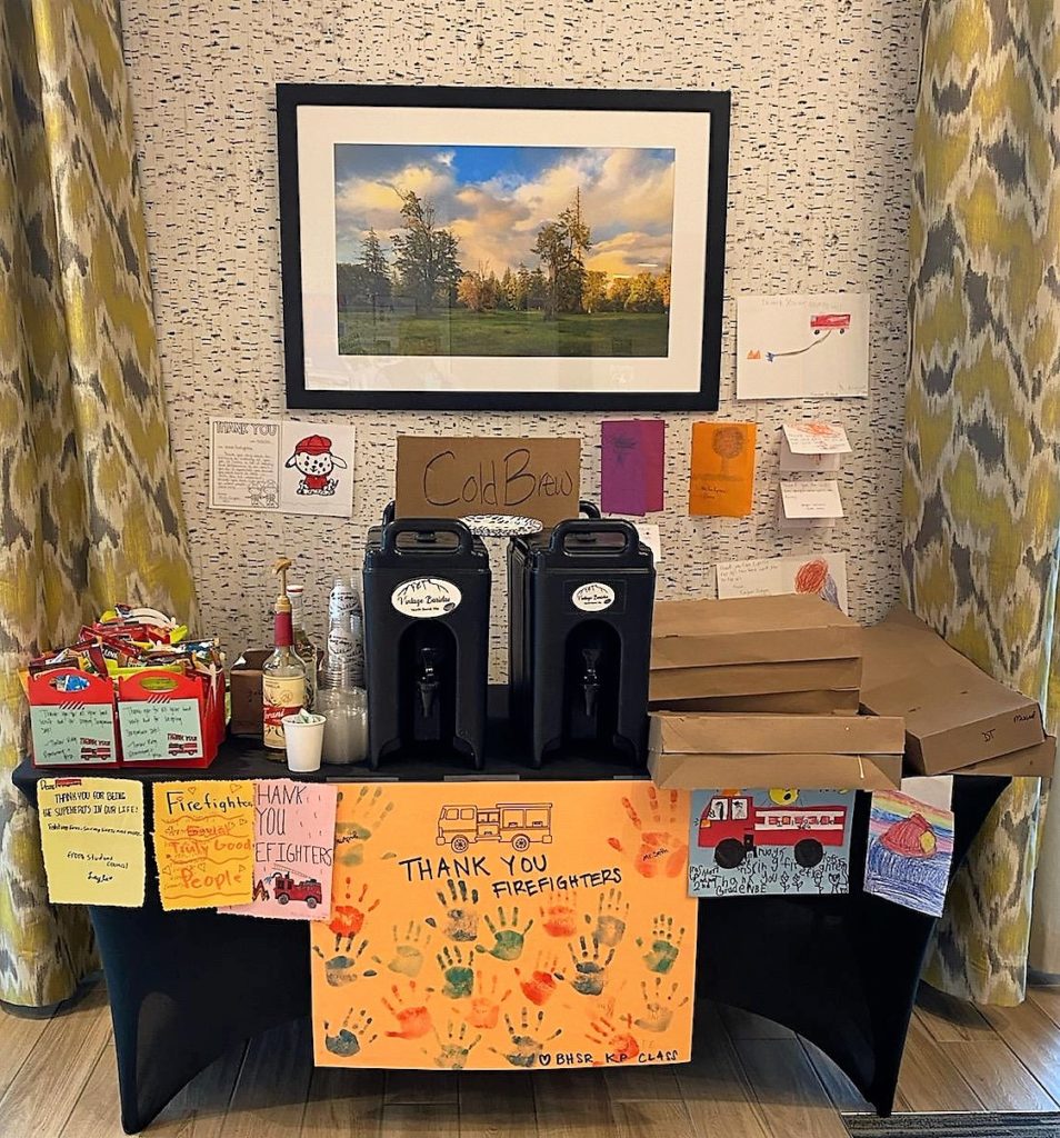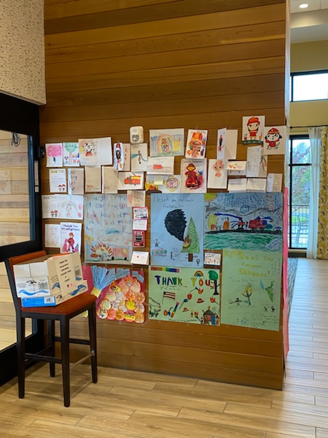 James put up a Facebook post about speaking with firefighters at the hotel to brainstorm ideas with the community about helping them while they helped us. Laurie Hay, Director of Sales & Marketing at Hotel America, stepped in with a great idea to create a message board where people could drop in cards, signs, and letters of encouragement for the firefighters.