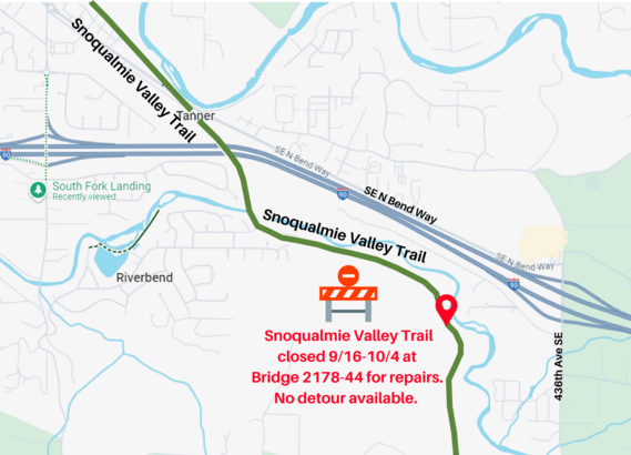 A portion of the Snoqualmie Valley Trail near Riverbend and Tanner will be closed from September 16 – October 4, 2024, to repair bridge 2178-44.