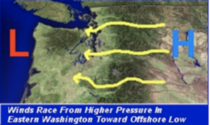 By mid-late November, Central and Eastern WA areas (eg Cle Elum, Ellensburg, Wenatchee) begin to consistently dip below freezing at night and a dome of high pressure engulfs the region for much of the winter months.  This primes the pump so to speak for offshore storms (low pressure) that brush by to start pulling over that high pressure air east of the mountains in an attempt to find atmospheric balance.