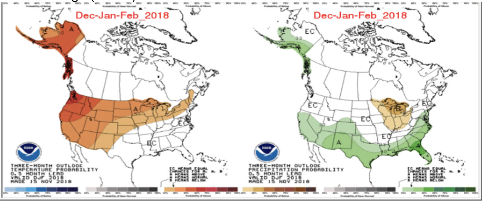 But can the recent past and present paint us a good picture of what to expect for the upcoming fall/winter storm season? Most people realize weather forecasting out more than a few days seems to be a total crapshoot. Sorry, weather modeling hasn’t come that far (yet). Here was NOAA’s 90-day outlook as of mid-November last year.  As seen below, they were predicting above average temperatures (Reds) last winter.