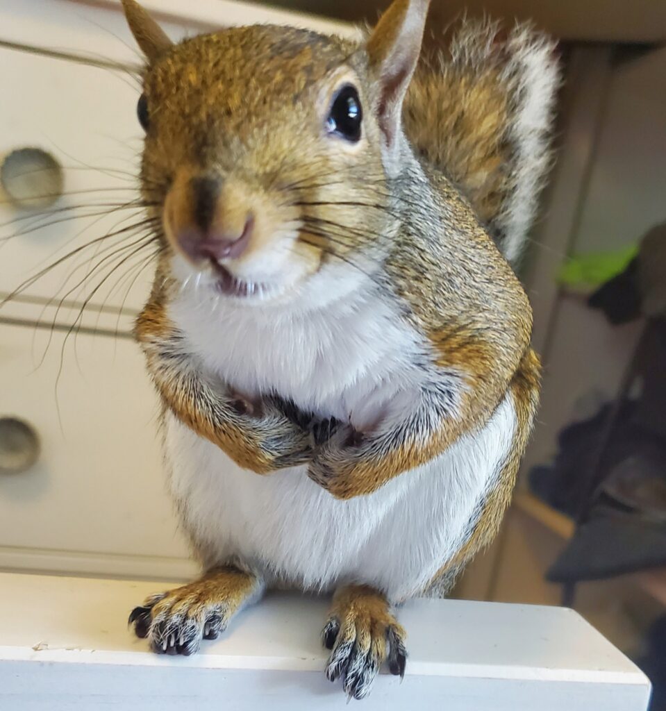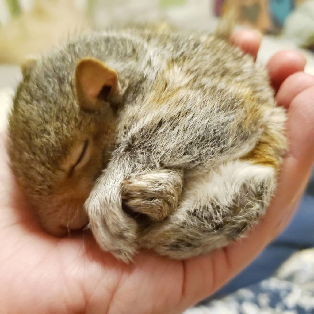 Since the pair knew nothing about squirrels, they were afraid to pick her up but eventually, using a t-shirt, took her home. Says Mazac, “I had no idea what to do with her. Then I did all the research to find out how to keep her alive. I had called PAWS and talked to someone who had told me that they were not taking her species, and they told me I could bring her in to be euthanized. At that point, I had already started to fall in love. (It doesn’t take me long). And of course, I now had a purpose again and something to nurture.”
