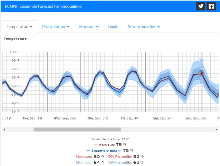 And summer looks to have at least a few more laughs. That is, we may not be done with 90°s. The GFS model is hinting that a thermal trough will develop over the West, kicking up offshore flow and sending temperatures above 90° in many spots West of the Cascades by about Labor Day.