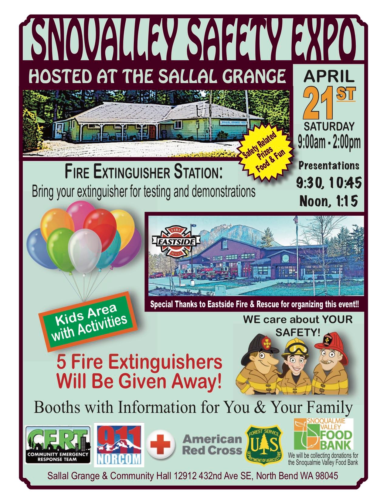 The Sallal Grange in North Bend invites the community to join them for the SnoValley Safety Expo on Saturday, April 21st from 9AM – 2PM. Community members can learn how to prepare for emergencies, how to stay safe.. AND have fun doing it!