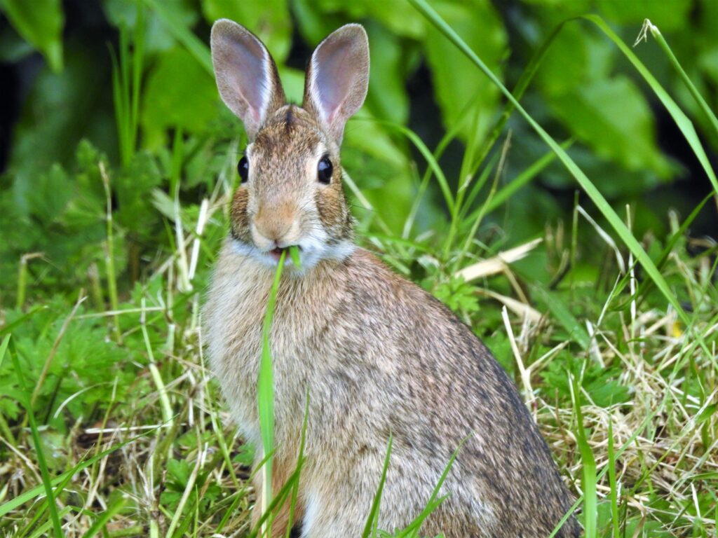 Eastern cottontail rabbit chewing on some grass.