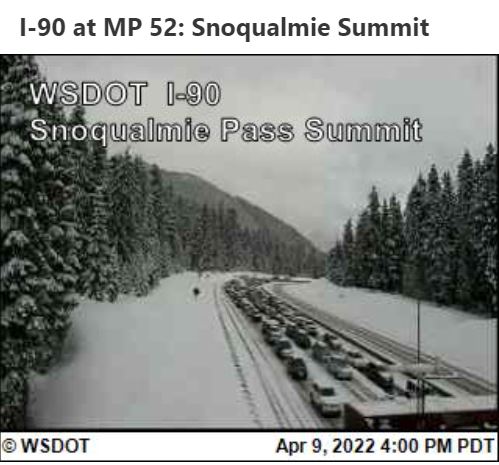 As of 4:00 PM on Saturday, April 9th, I-90 Snoqualmie Pass is closed Eastbound at milepost 34 near North Bend and Westbound at milepost 106 near Ellensburg due to collisions.