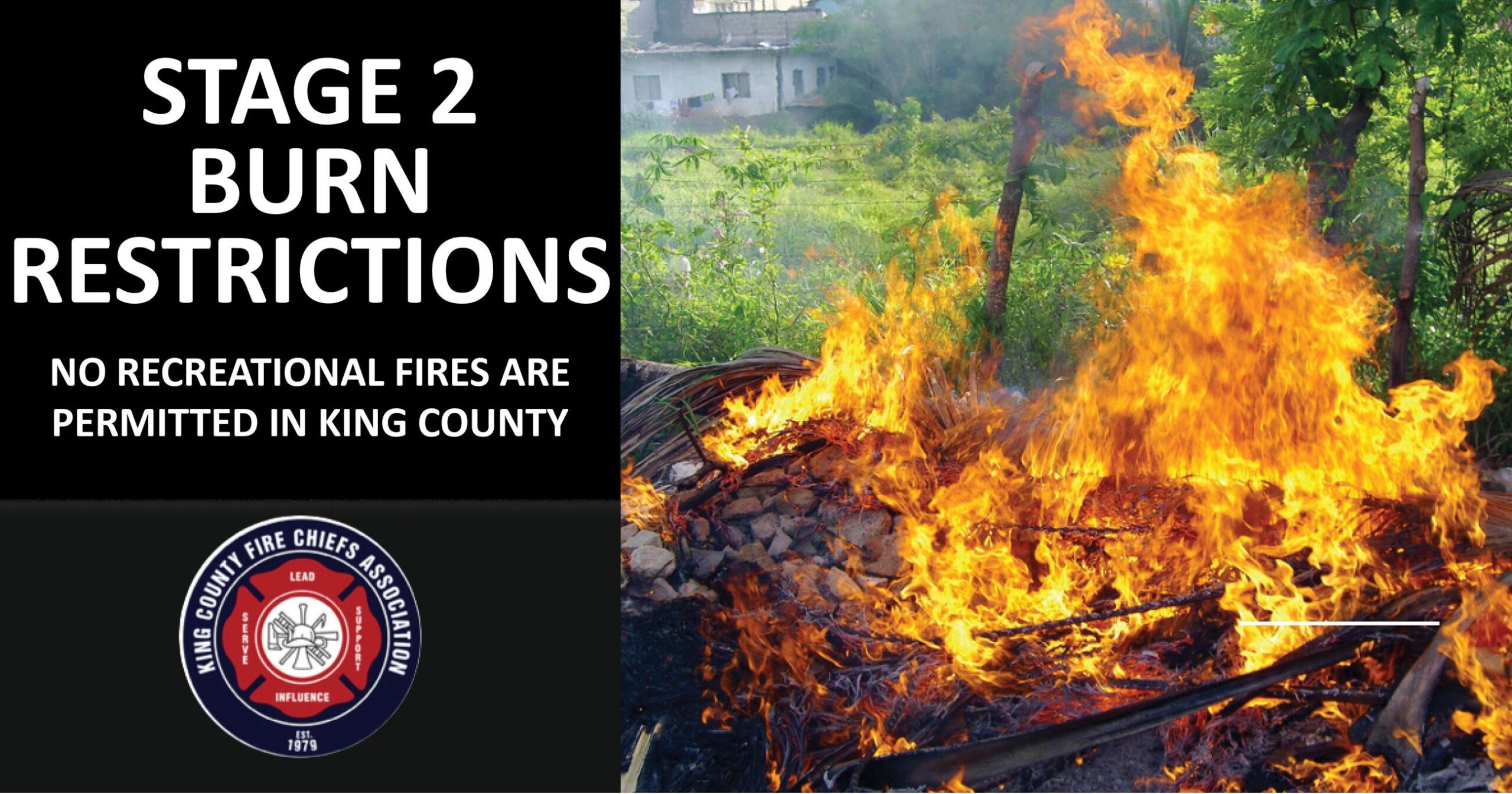 Effective immediately, the King County Fire Marshal and the King County Fire Chiefs Association, in coordination with local jurisdictions, have issued a Stage 2 Complete burn ban on all outdoor recreational fires throughout King County.