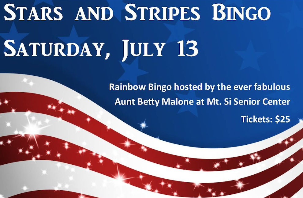 Independence Day may be gone according to the calendar, but the festivities will continue on Saturday at Mt. Si Senior Center, where the always fabulous Aunt Betty Malone is hosting Stars and Stripes Rainbow Bingo – Saturday, July 13th – starting at 6:30PM.
