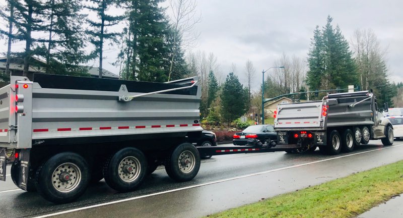 These dump truck with trailer throw more rocks than any other vehicle I’ve ever seen. My car has a $3500 windshield which was cracked by one of these. I took the car out 2 weeks later having only 50+ miles with the new windshield and another one of these monsters let loose with a barrage of rocks that put 2 chips in the new windshield as I was trying to accelerate past. These guys need to drive their trucks over a steel grating as they are leaving the site to remove tread rocks as well as cover their loads. Ridiculous!