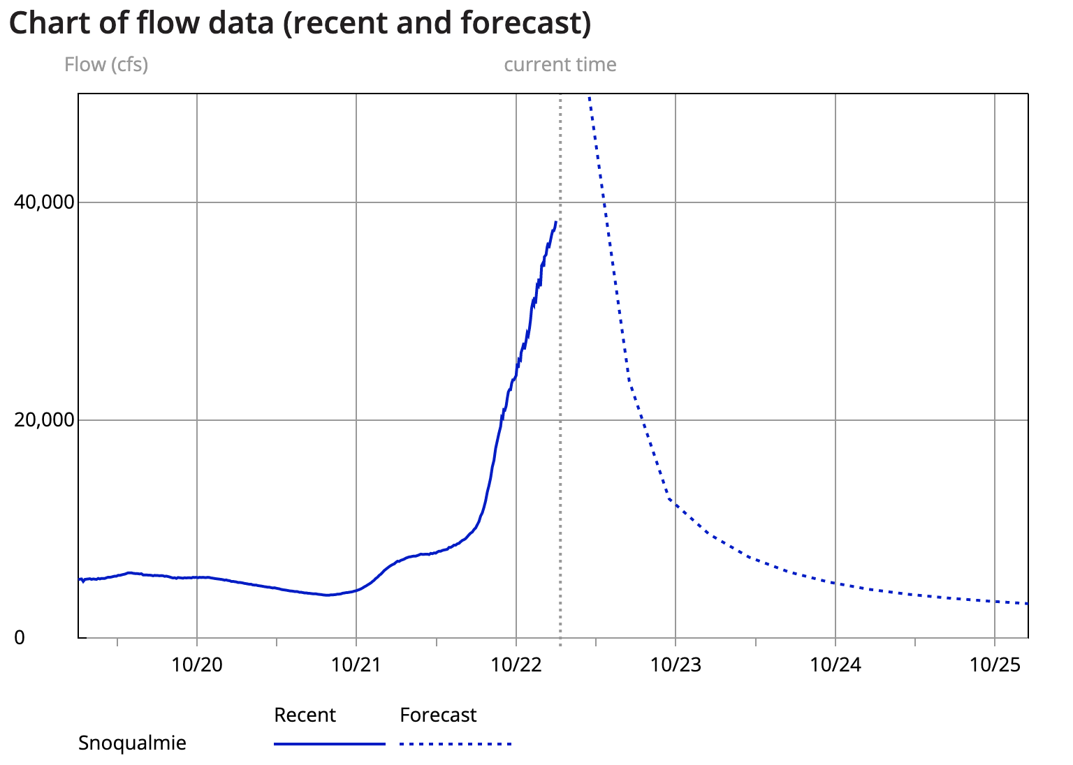 King County expects the Snoqualmie River to crest around 11AM, October 22nd at around 50,000 c.f.s. The National Weather Service said if the Snoqualmie River reaches this level it would make it the 11th highest flow in history. It should fall below flood stage by Wednesday afternoon.