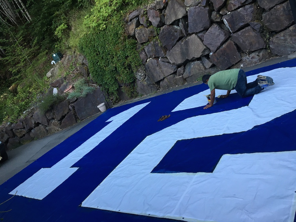 So just in time for the frenzy of a new Seahawks season, Mike and friends got to work and constructed a brand new HUGE 12 sign ready to take on the weather – and the drama of another football season. A new massive blue tarp is the backdrop, with large white numbers carefully cut out of white plastic and secured to the sign.