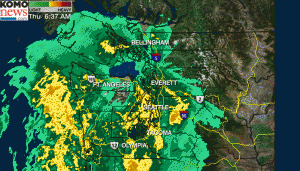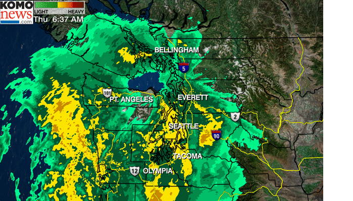 A front is currently offshore and will move through Western Washington today. A soaking rainfall is prevalent ahead of the front, and this shield of rain will be with us until the early afternoon. Rain will taper to showers behind the front later today, but it will stay chilly all day long. Highs will only reach the upper 50s today.