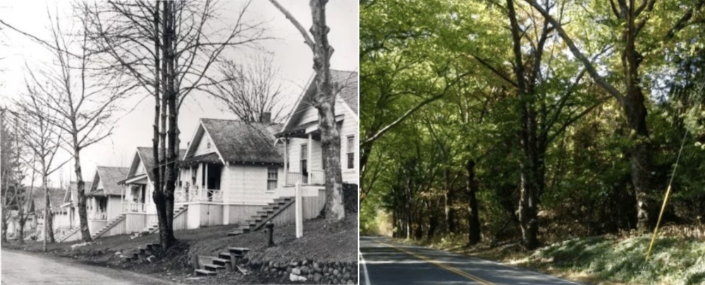 This area was known as the Riverside Neighborhood in the mill town.  The houses by the sycamores were moved in the 1950s and almost every one of the approximately 250 single-family homes from the mill town of Snoqualmie Falls, Washington are in use today, somewhere in the Valley.