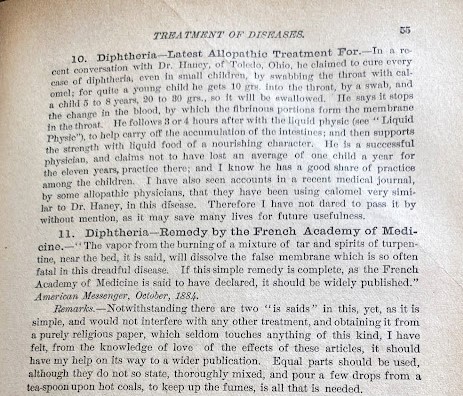 He claimed to have clipped the recipe from a newspaper years before and that it healed his son of diphtheria. The remedy included a tablespoon of turpentine and a tablespoon of liquid tar in a tin cup. It was then lit on fire to create a “dense, resinous smoke…making the room dark.” The smoke was supposed to break up the plaques in the back of the throat to allow the patient to cough up the “microbes” from the disease. Dr. Chase’s book also includes a similar treatment recommendation.