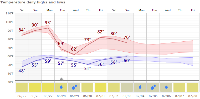 Saturday’s high will be in the upper 80’s. On Sunday and Monday, the Snoqualmie Valley’s highs will be in the mid to low 90s. We’ll have a slight breeze, so that should help a little. The lows will be in the low 60’s starting Saturday night.