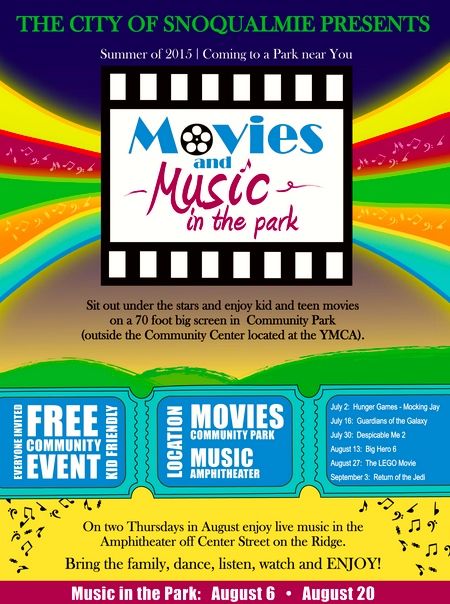 Back by popular demand, the City of Snoqualmie announced this week that it will be sponsoring ten, weekly “Movies & Music in the Park”events starting Thursday, July 2, 2015.