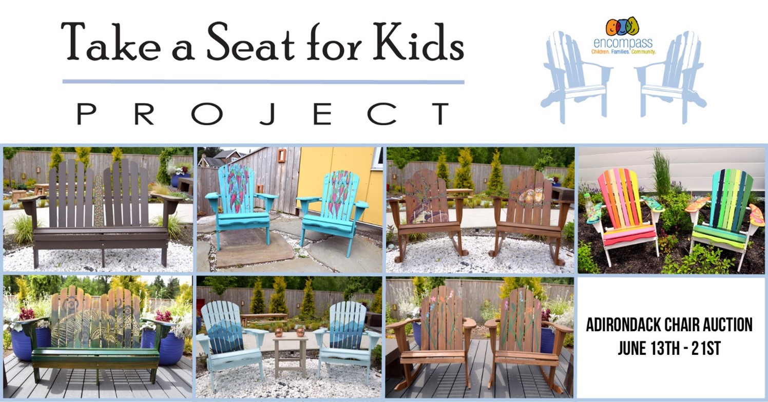 In a first for this event, Encompass will host a Garden Party on Sunday, June 12th, from 11 am – 1 pm at the Child Development Center, 9050 384TH Ave SE in Snoqualmie, where prospective buyers can preview the chairs in person.