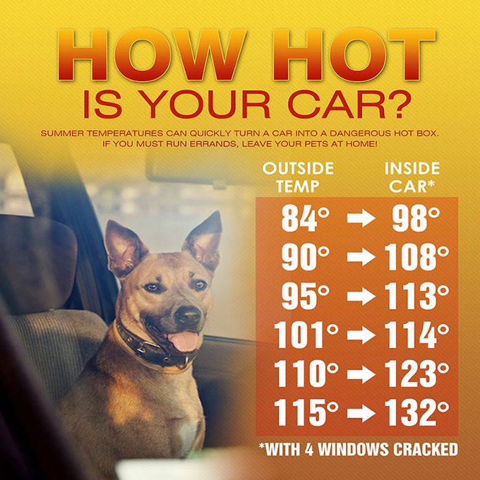 A note on your pets during a heat wave; please do not leave pets in your car. Even with windows cracked, the temps can be 10° to 20° higher in your vehicle.