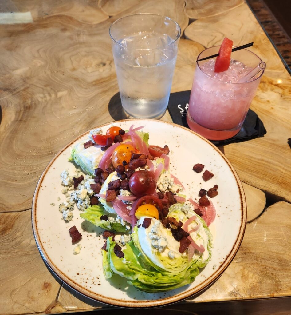 She began with the wedge salad, featuring baby iceberg, heirloom tomato, pickled shallots, guanciale, and smoky blue cheese dressing. Anne said it hit the spot perfectly with just the right amount of blue cheese and bacon. She paired it with the Blue Lavender Drop, a spirit-free cocktail that was light and refreshing, with undertones of lavender and lemon.
