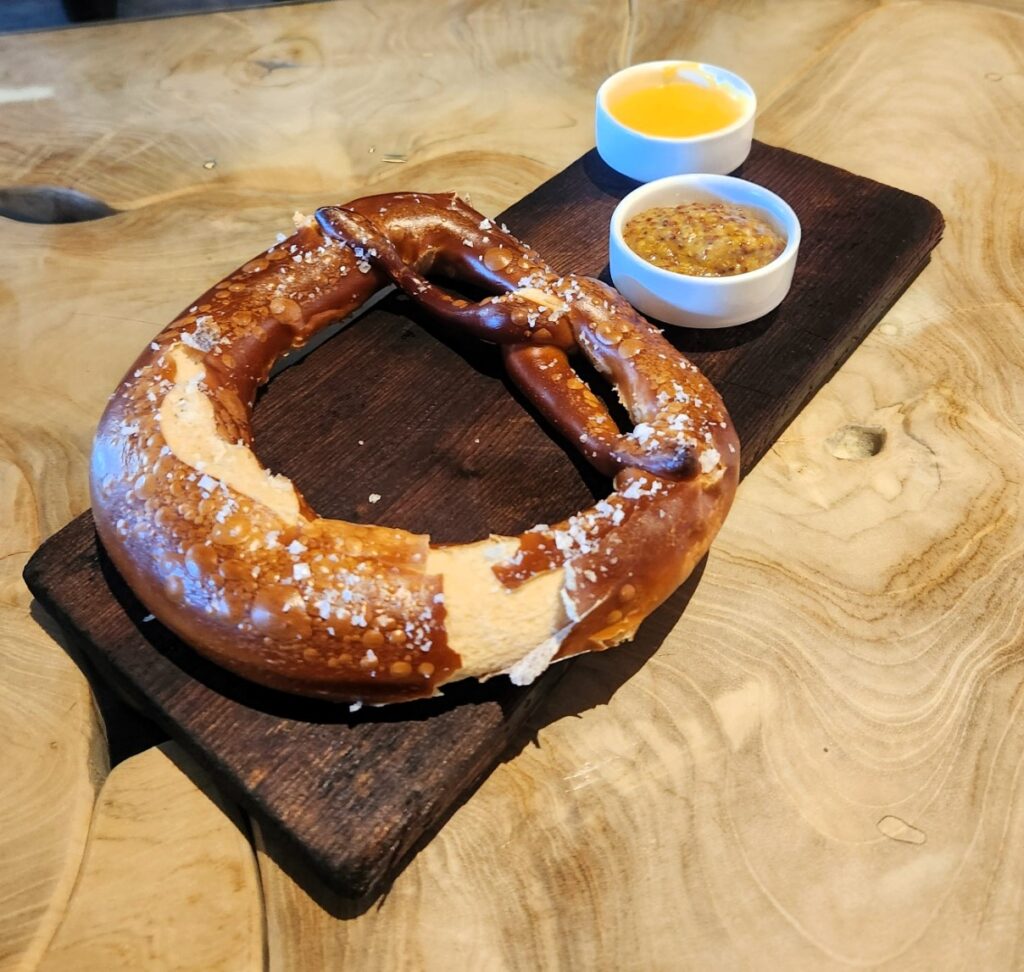 I, too, had the wedge salad, though I skipped the running part. We shared the soft pretzel, which was perfectly baked with a golden crust and a soft interior. The beer cheese was rich and tangy, complementing the pretzel wonderfully. The fried pickle dip was a delightful surprise, featuring dill and Calabrian chili, providing a flavorful punch balanced by cool ranch. The breadcrumbs added a nice texture, and the house-made chips were crispy and well-seasoned.