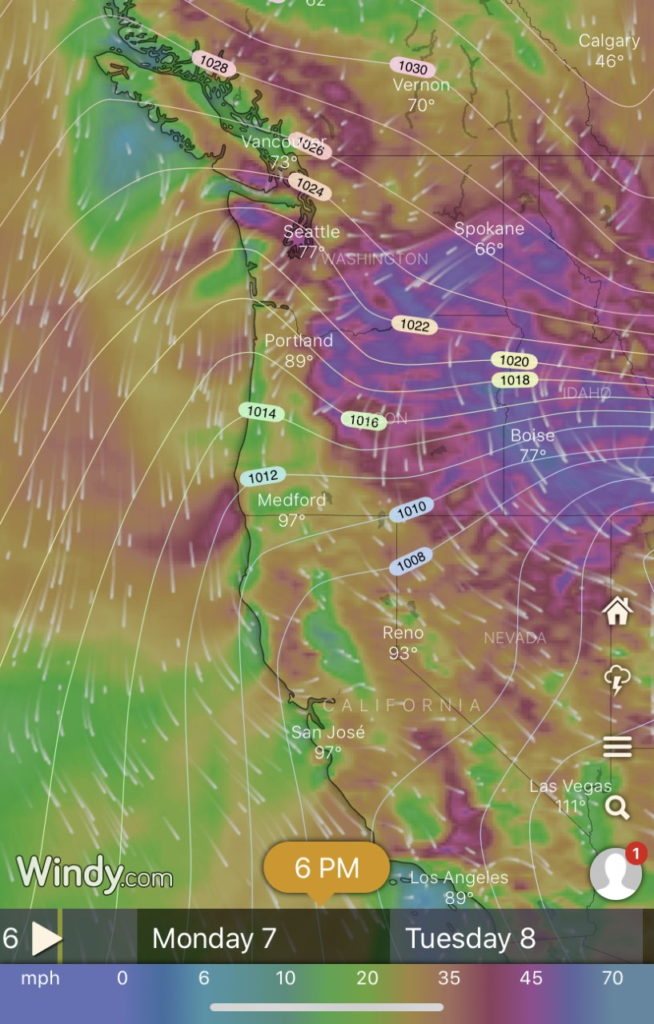 A rare late summer pressure gradient is expected to set up Monday evening into Tuesday as an unseasonably strong upper-level trough dives down from Canada towards the Rockies. This air will try to balance out with lower pressure out over the Pacific, generating our all too familiar Cascadia (gap) wind setup. The National Weather Service believes the type of incoming pattern at this time of year probably only occurs about every 30 years.