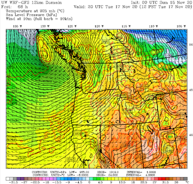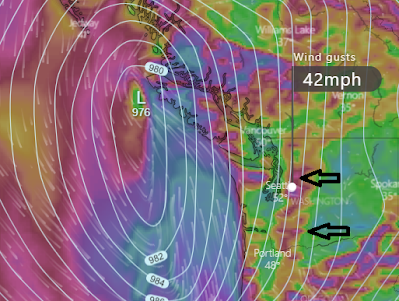 You can see (below) that by noon Tuesday how narrow the isobars (representing air pressure difference) are over western Washington, and particularly over the Olympic Peninsula.