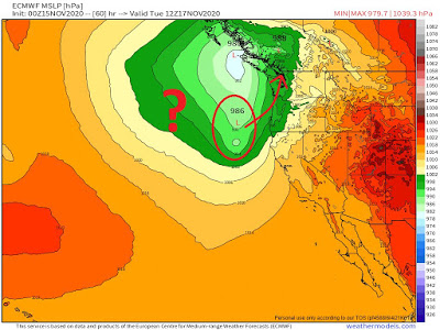 If the actual strength of this Low is anywhere close to what is currently forecasted, at the very least Snoqualmie Valley should see a significant gap windstorm (40+ mph) as higher pressure east of the Cascades rushes through the mountain gaps to mix with lower pressure in W. WA.  We average half a dozen or so significant gap windstorms per fall/winter season.