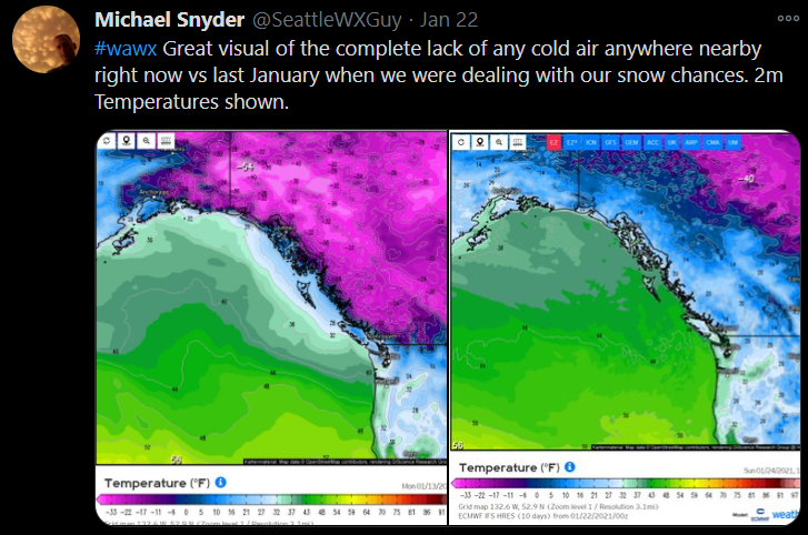 We’re just not seeing the building cold air out of B.C. as we saw with last year’s Janmageddon storm that dropped 15-20″ of snow around the Snoqualmie Valley in mid-January 2020.