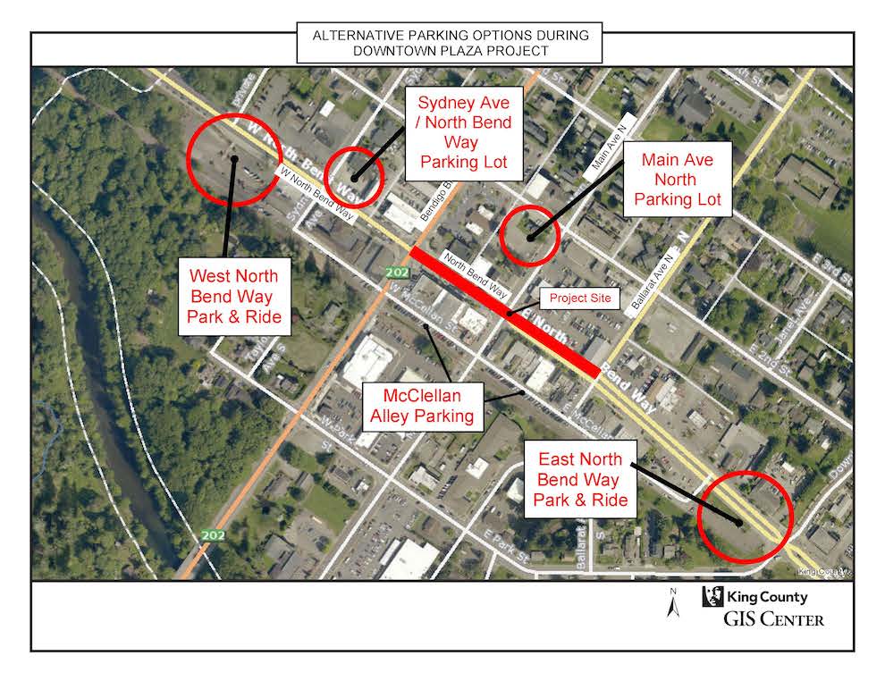 During the North Bend Way/Main Ave closure, there will also be reduced parking near the construction area. Traffic detours and signage will be in place to direct people around the project site, along with signage pointing drivers to alternative parking locations.