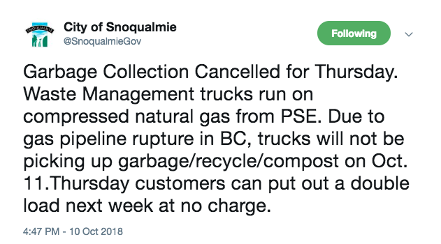 The City of Snoqualmie announced Wednesday evening that garbage collection for Thursday, October 11, 2018 was cancelled due to a natural gas pipeline rupture 500 miles away in British Columbia, Canada.