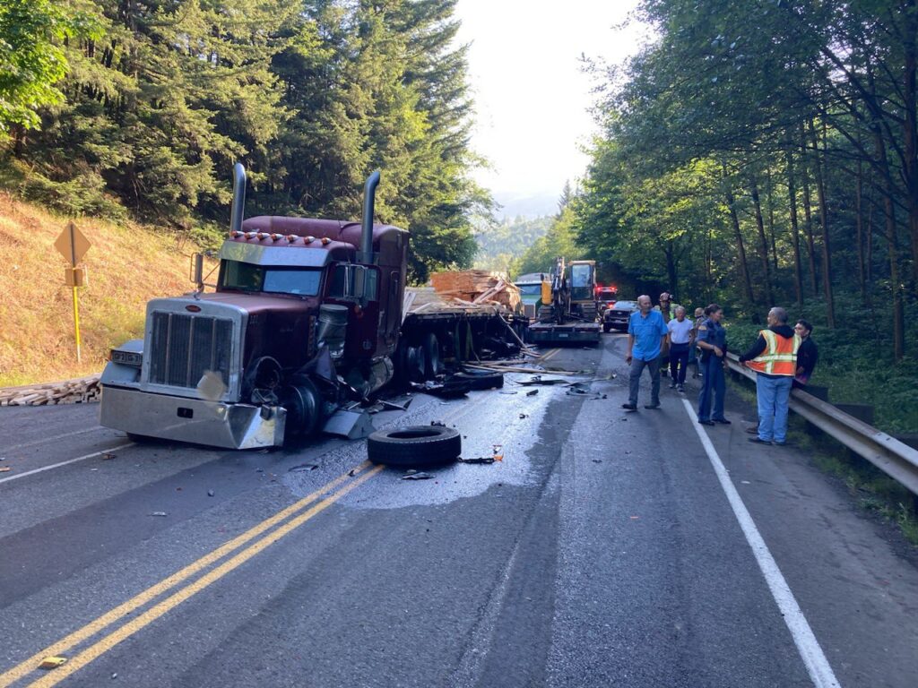 This is a three-semi, two-car injury collision with a fuel spill involved. Eastside Fire & Rescue is responding.