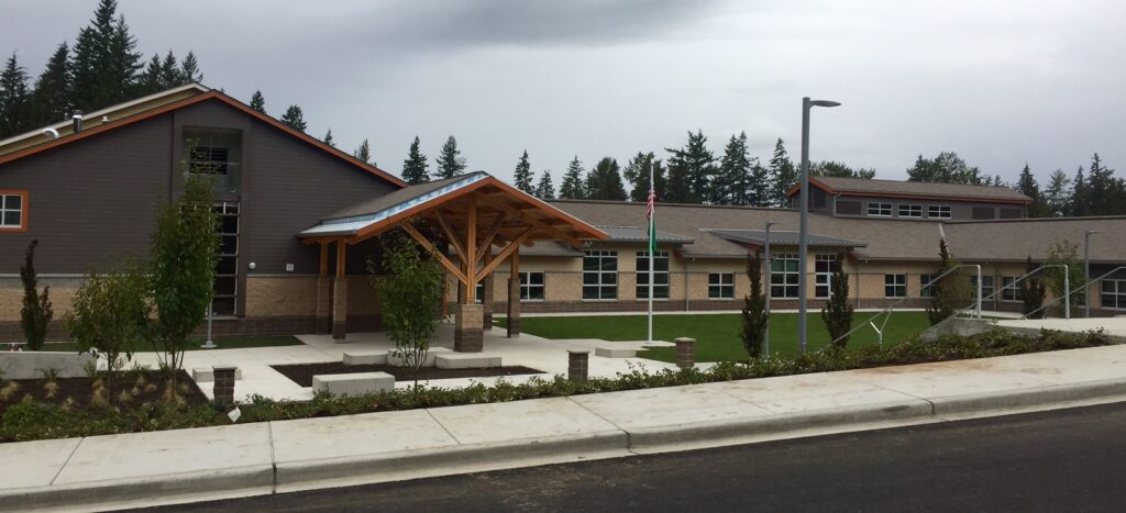 The $35 million school is very similar to Cascade View Elementary, with a few tweaks based on feedback from CVES staff – like a slightly bigger gymnasium and a covered playground. Each classroom wing also has one additional room, which increased permanent capacity.