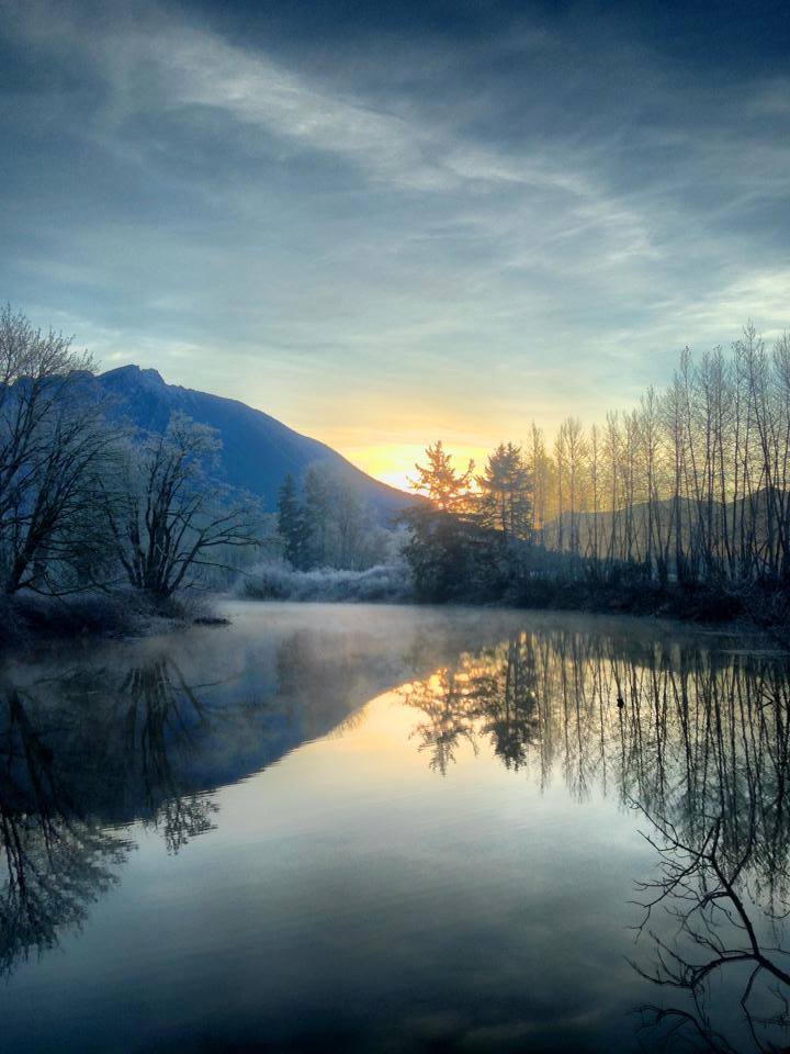 Drum roll please! Rana Hoover wins the 2013 title for the most popular Snoqulamie Valley photo shared on the Living Snoqualmie Facebook page. She said the sight of the river and the sunrise took her breath away on November 21st. She was in the right place at the right time and luckily had her cell phone along to capture the moment. Taken near Three Forks Dog Park in Snoqualmie. Nearly 600 people clicked like; over 40 left comments; and the photo was shared nearly 140 times.