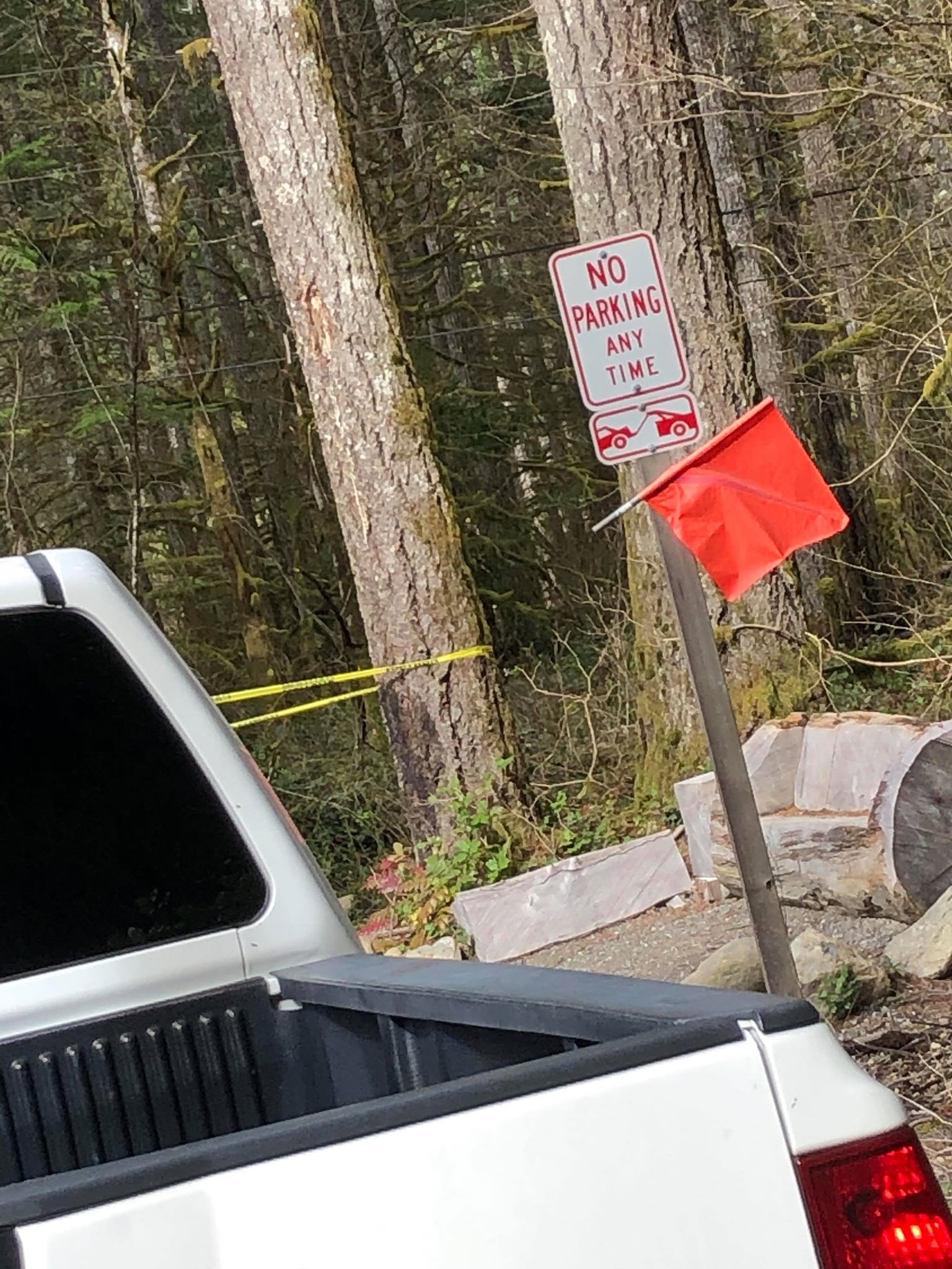 By 2PM King County Sheriff Office Deputies and tow trucks were spotted on Mt Si Road. Two vehicles were being towed, one appeared to be the illegally parked pickup truck. [See video below]