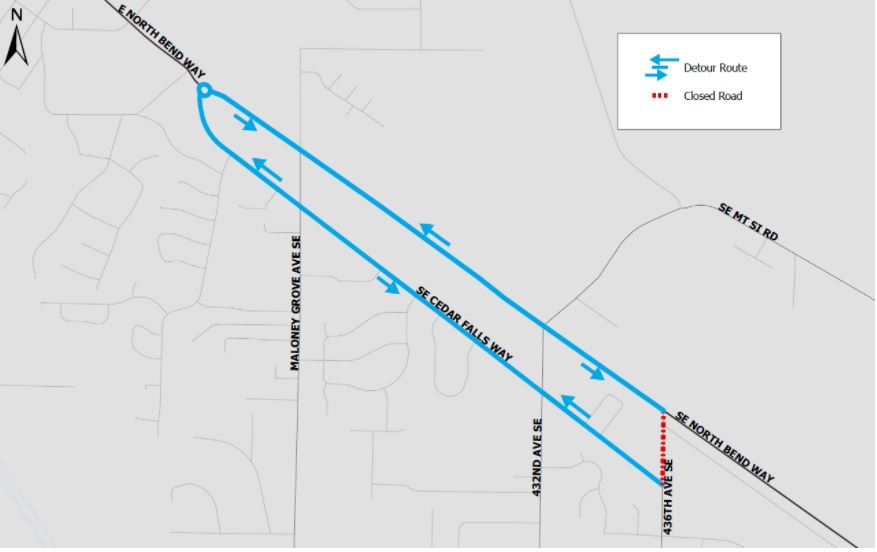 Detour routes will be marked along North Bend Way and Cedar Falls Way in the project area. Local access for residents of 436th Ave SE will be provided.