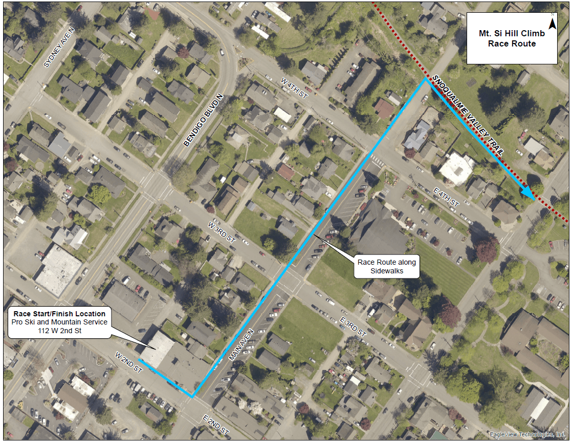 Approximately 150 runners are expected at the event that will utilize City sidewalks in the vicinity of W. 2nd Street and Main Ave N. The Mt. Si Hill Climb starts and finishes at Pro Ski and Mountain Service, located at 112 W. 2nd Street.