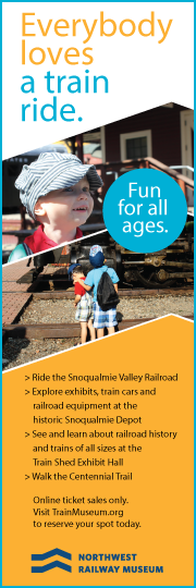 Beginning in April, Train Rides will be offered on Saturdays and Sundays. Passengers can depart from either the Snoqualmie Depot or the North Bend Depot. Please make ticket reservations online in advance at: TrainMuseum.org.