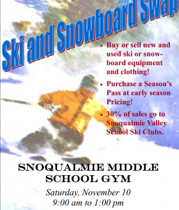 This annual event is great way to avoid breaking the bank while getting new ski/snowboard equipment for your growing child. On Saturday, November 10th from 9AM – 1PM in the Snoqualmie Middle School gymnasium, there will be great deals on new and used gear. You can also purchase your Summit at Snoqualmie ski pass at the early season pricing rate. For those who would like to sell items, please drop them off in the SMS gym on Friday, November 9th from 3:30-6:00PM. 30% of the sales go to Snoqualmie Valley School Ski Clubs. To view the event flier click HERE.