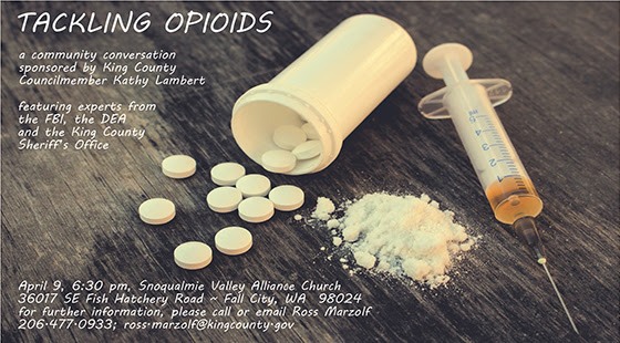 King County Councilmember Kathy Lambert is sponsoring an important town hall-type meeting Monday, April 9, 2018 to discuss the opioid problem facing the Puget Sound region.