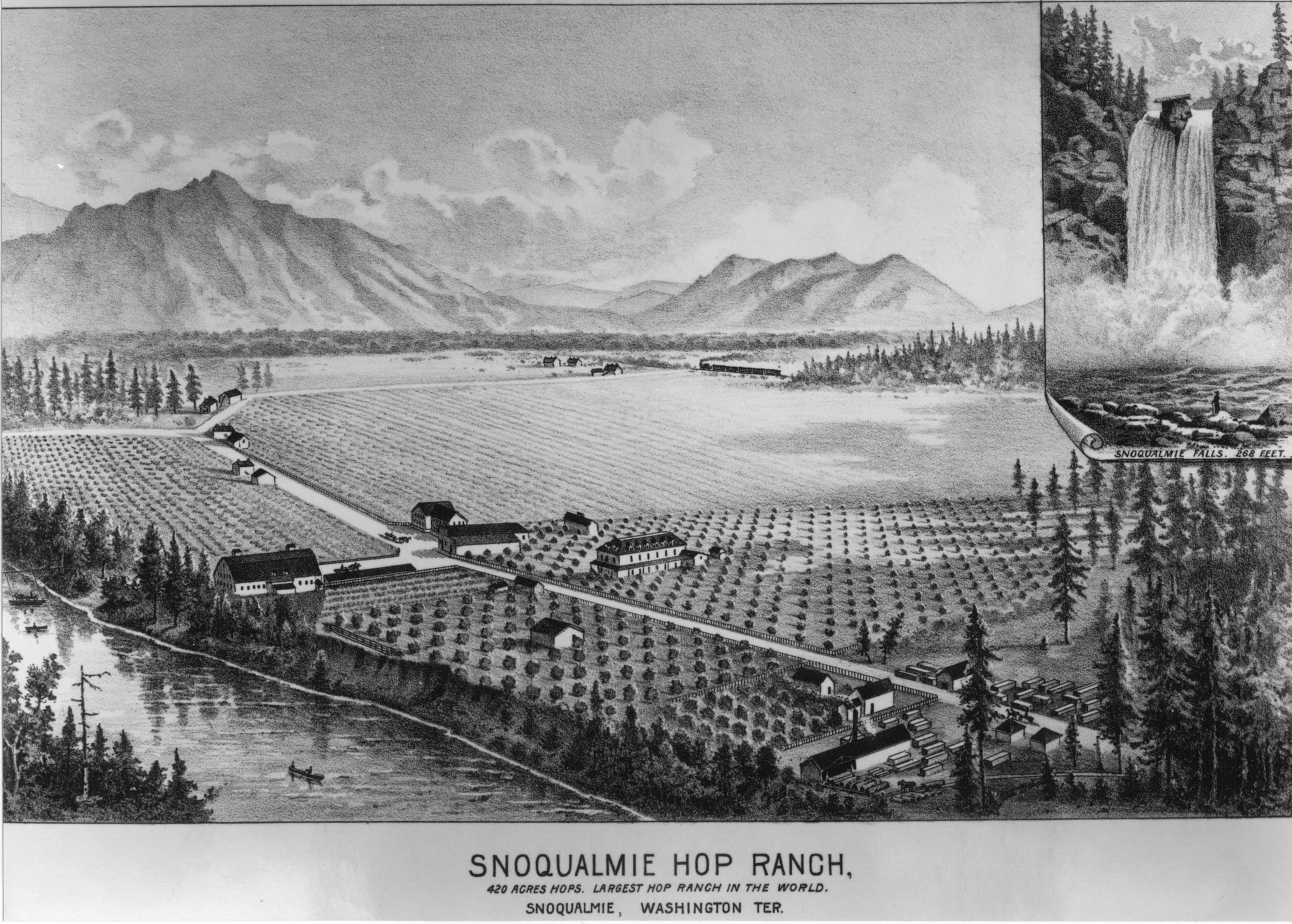 In 1882, Borst sold much of his land (later named Meadowbrook Farm) to the Hop Grower’s Association, which at the time gave the Valley floor between Snoqualmie and North Bend billing as the “largest hop ranch in the world.” The fruit crop was still important, though. In 1886 the farm produced “about 5,000 bushels of apples.”