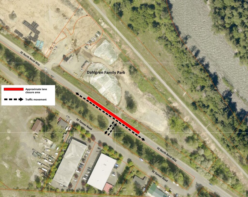 Specifically, the lane closures will impact the westbound lane and the center turn lane of SE North Bend Way near the crossroad with SE Tanner Road (refer to the provided map for details). There will be traffic signs in place to guide drivers, and flaggers will be stationed to direct the flow of vehicles taking turns using the eastbound lane.