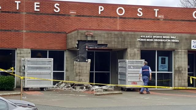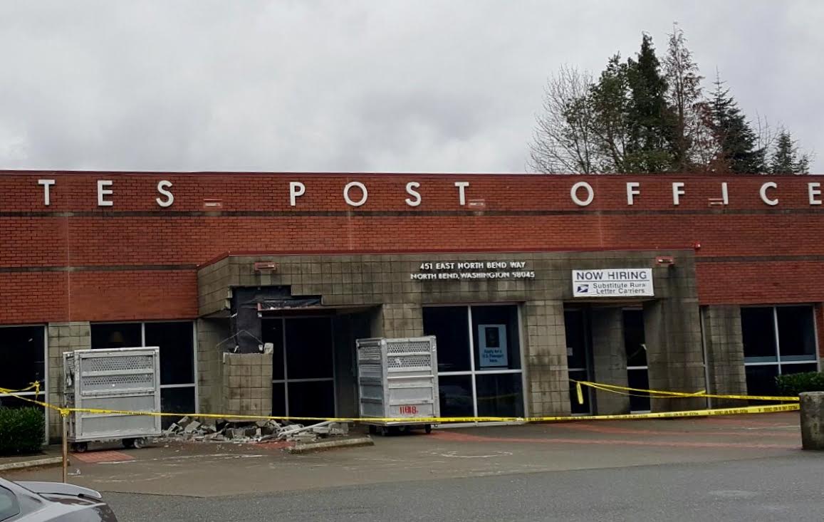 On Tuesday afternoon, March 14, 2017, City of Snoqualmie Public Information Officer Joan Pliego said a vehicle had struck the North Bend Post Office, located at 451 E. North Bend Way. The post office remained open after the incident.