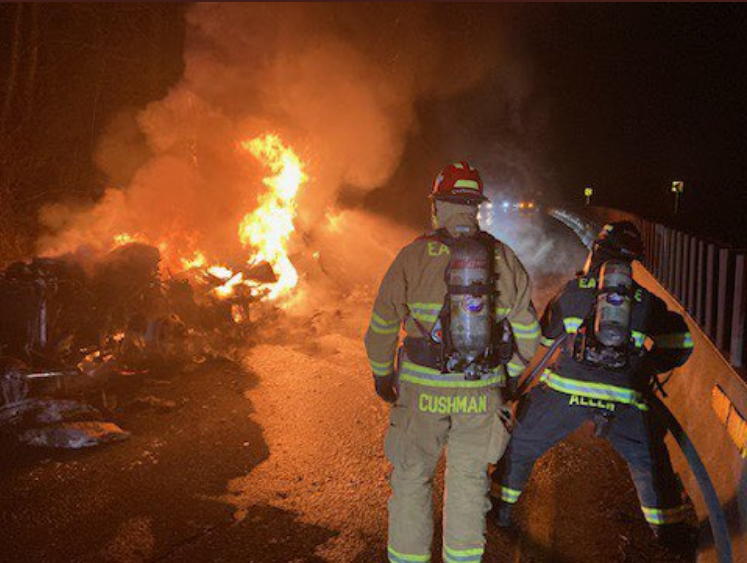 The tractor-trailer became fully engulfed, and Eastside Fire & Rescue arrived to extinguish the flames.