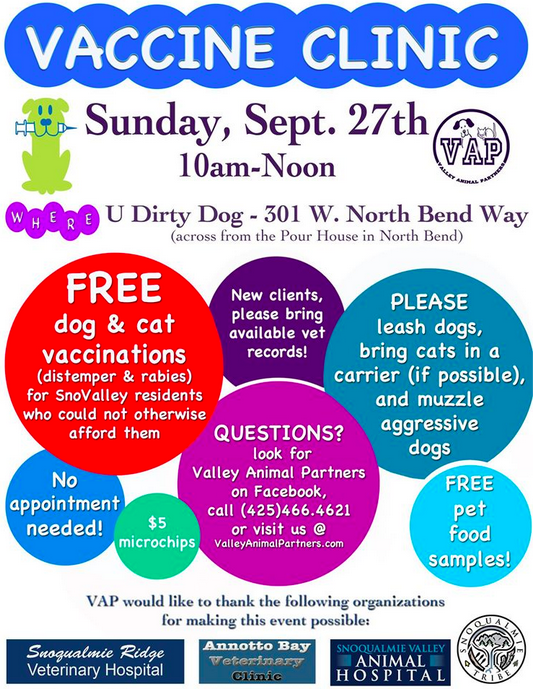 Valley Animal Partners (VAP) is hosting free vaccine clinic on Sunday, September 27th from 10AM to Noon at U Dirty Dog, 301 W North Bend Way. The free vaccines and low-cost microchips are a service for pets of residents who could otherwise not afford them. No appointment is necessary – just stop on by!