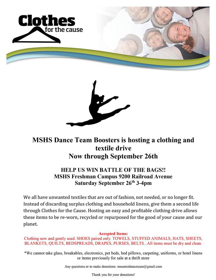 Then bag them up and bring them down to the Mount Si Freshman Campus, 9002 Railroad Ave SE, on Saturday, September 26th from 3 – 4PM and help the MSHS Dance Team win the Battle of the Bags, a Clothes for the Cause Fundraiser.