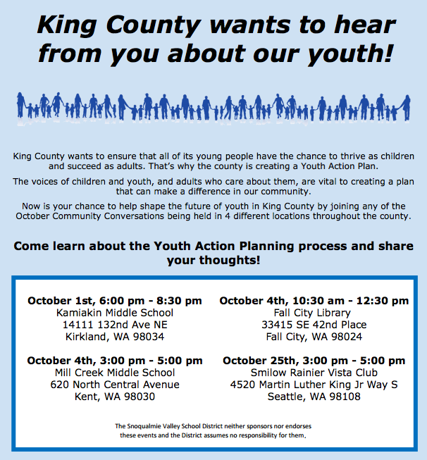Kids can help shape the future of youth in King County by joining Saturday’s ‘Community Conversation’ at the Fall City Library, 33415 SE 42nd PL (near Fall City Elementary). Lunch will be provided to attendees.